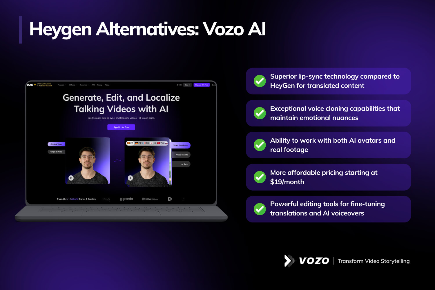Vozo AI is a leading HeyGen alternative in 2025, offering a comprehensive AI video platform that combines powerful translation capabilities with impressive avatar technology. This versatile tool has gained popularity among content creators seeking more advanced options for multilingual video production. Unlike HeyGen’s primary focus on avatar-centric videos, Vozo AI excels with its dual specialization in both lifelike AI avatars and sophisticated video translation.