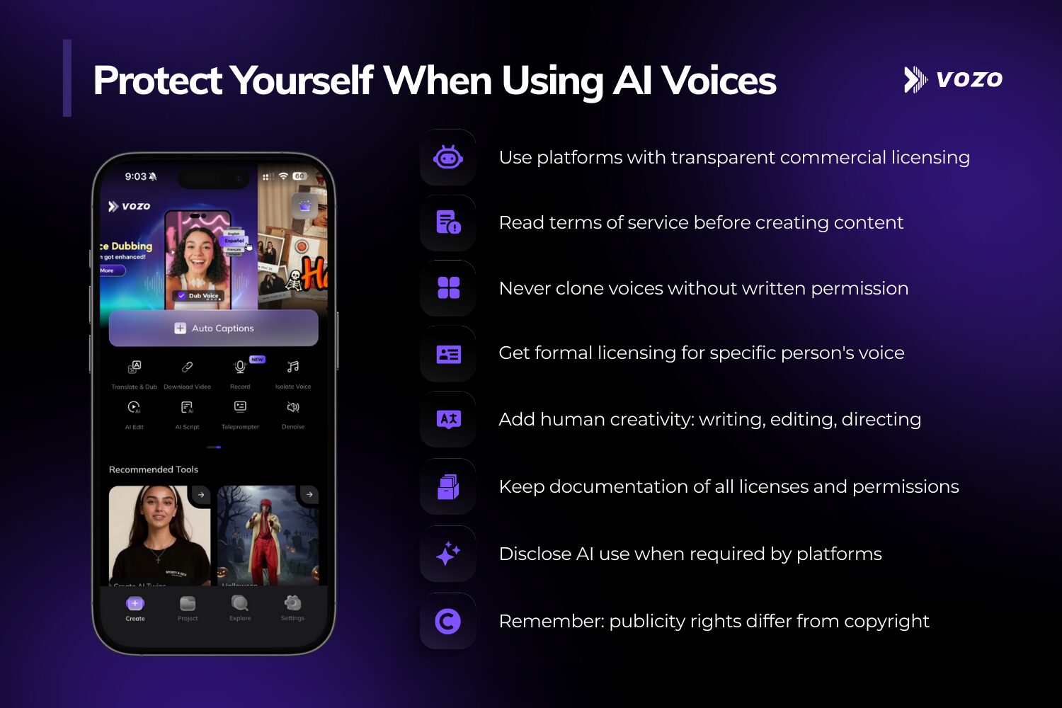 Vozo AI provides licensed voice technology through our dubbing, translation, and lip sync services compliant with international copyright standards. Ready to scale your content across 60+ languages with legal protection? Start using Vozo AI today for commercially licensed voice technology backed by transparent data sourcing and proper usage rights.