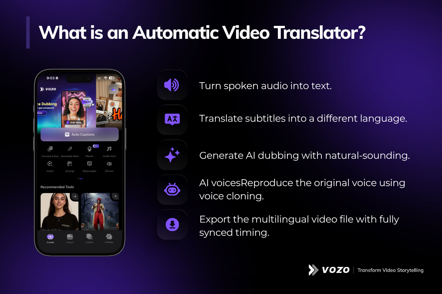 This is why an automatic video translator matters. Automatic video translation allows one video to be watched in a different language, with translated subtitles, AI voice dubs or full text tracks. Instead of recording multiple versions of the same content, the creator can let AI handle the conversion.
