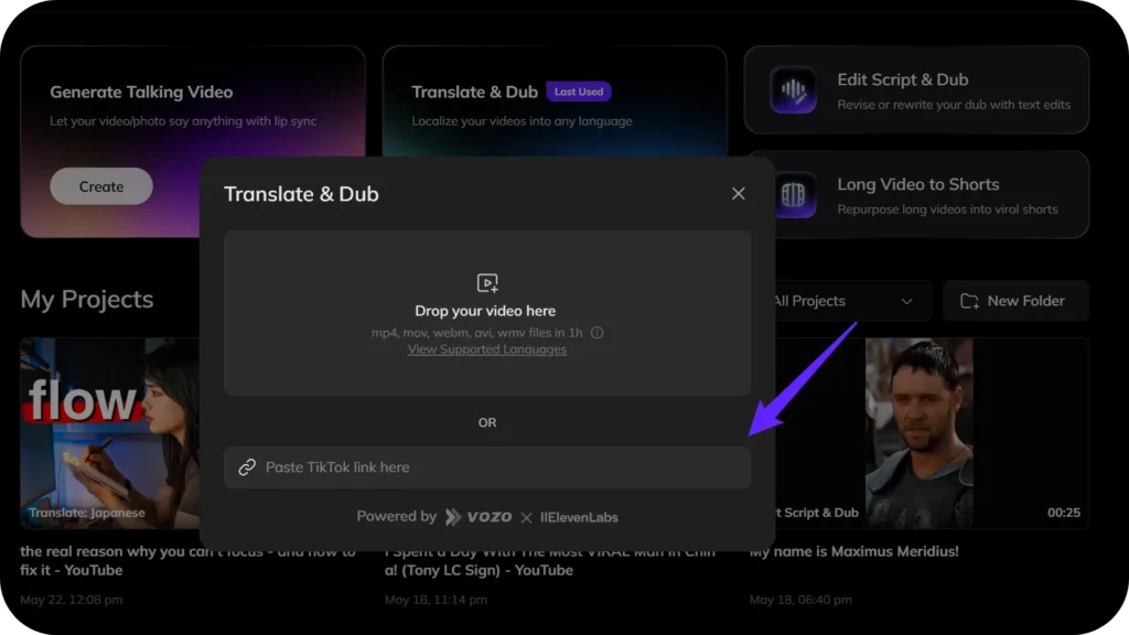 Copy the URL of the YouTube video you wish to translate and paste it into the designated field on Vozo’s platform. This gives Vozo the opportunity to fetch the video for processing directly.